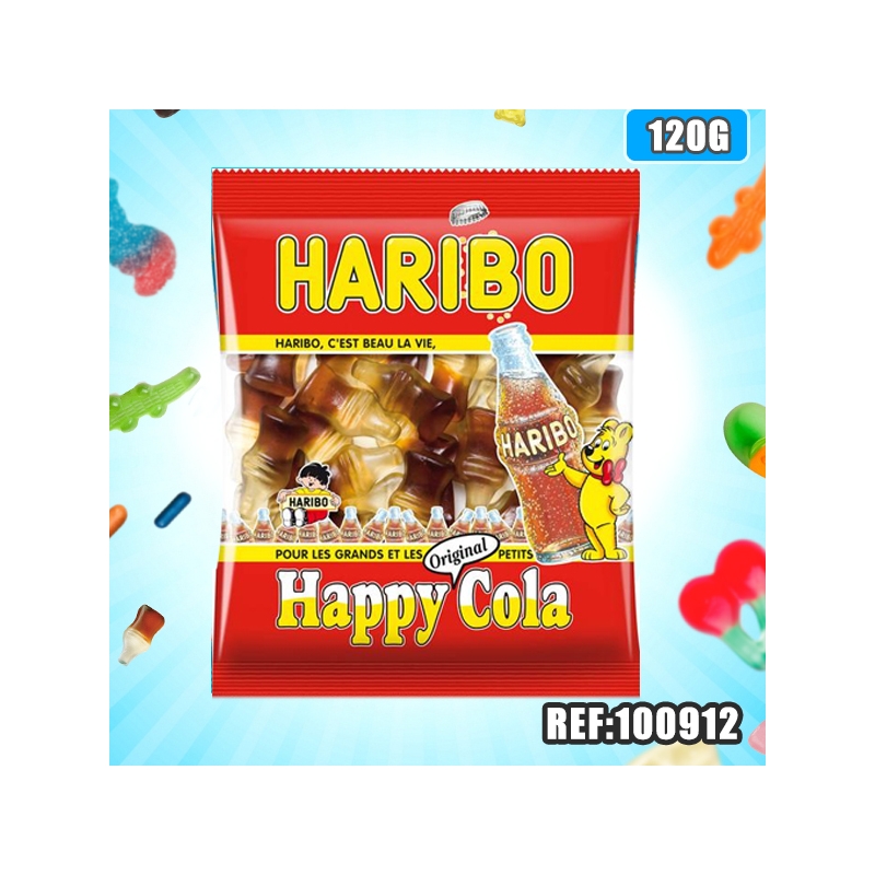 Ingrédients : Sirop de glucose, sucre, gélatine, dextrose, acidifiant : acide citrique, sirop de caramel, arôme, agent d'enrobage : cire d'abeille blanche et jaune, cire de carnauba. Tenir à l'abri de chaleur et de l'humidité. Valeur nutritionnelle pour 100g : 1411Kj/332Kcal, Matières grasses : 0.5g dont acides gras saturés : 0.1g, Glucides 75g dont sucres : 43g, protéïnes : 6.6g, sel : 0.03g.